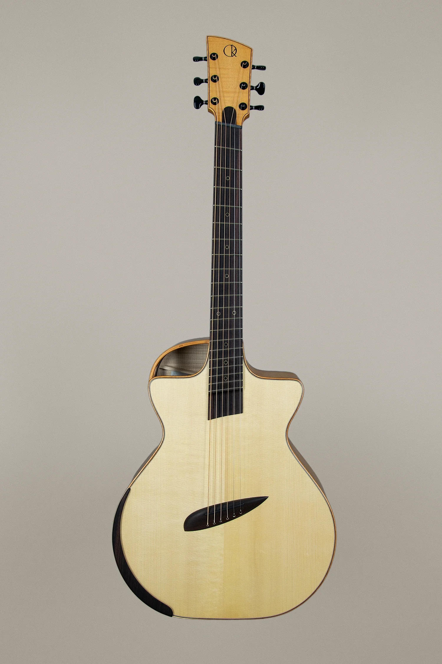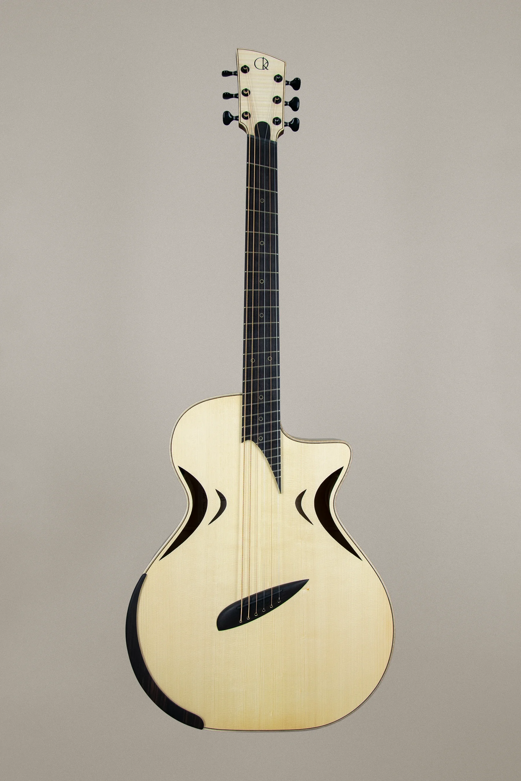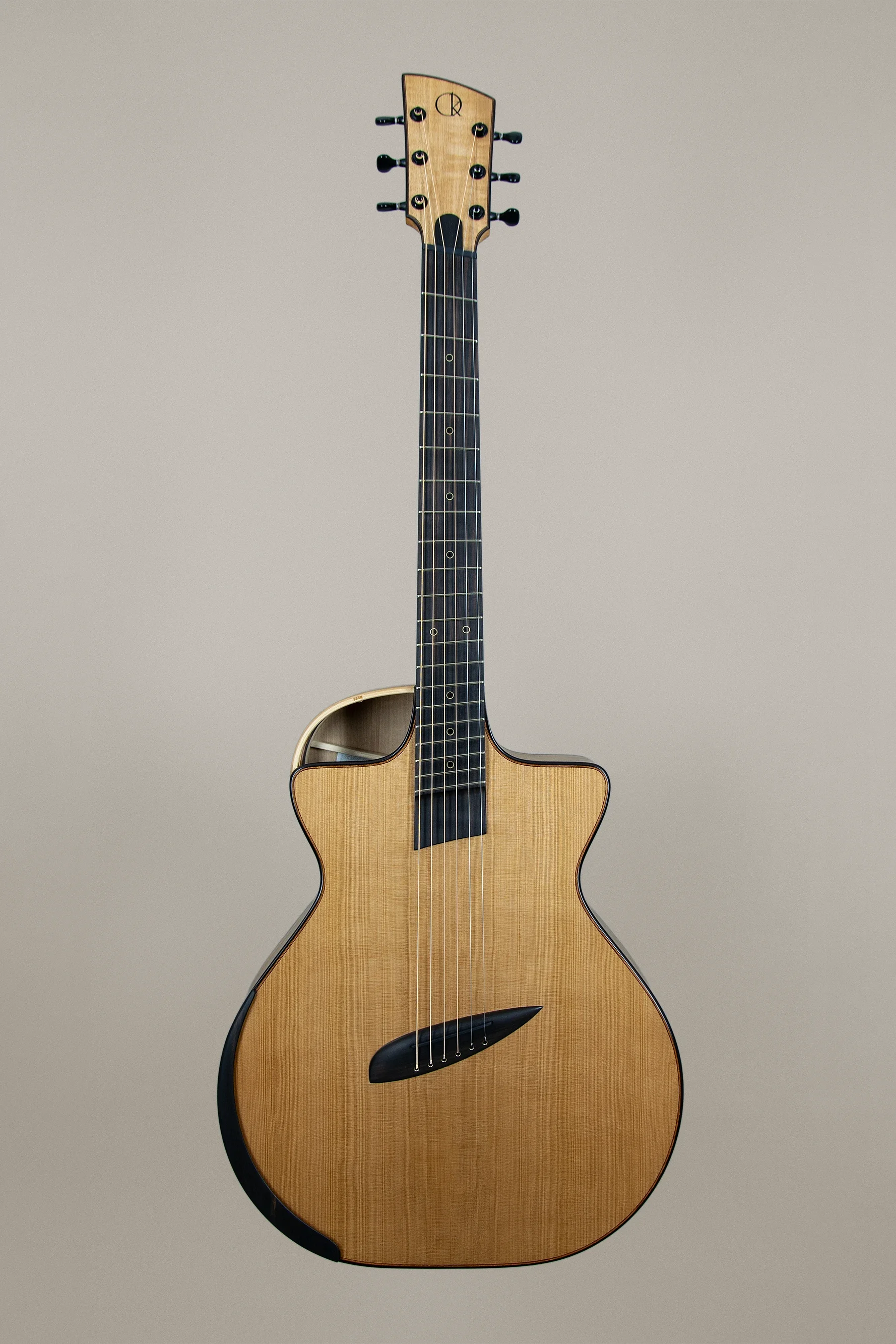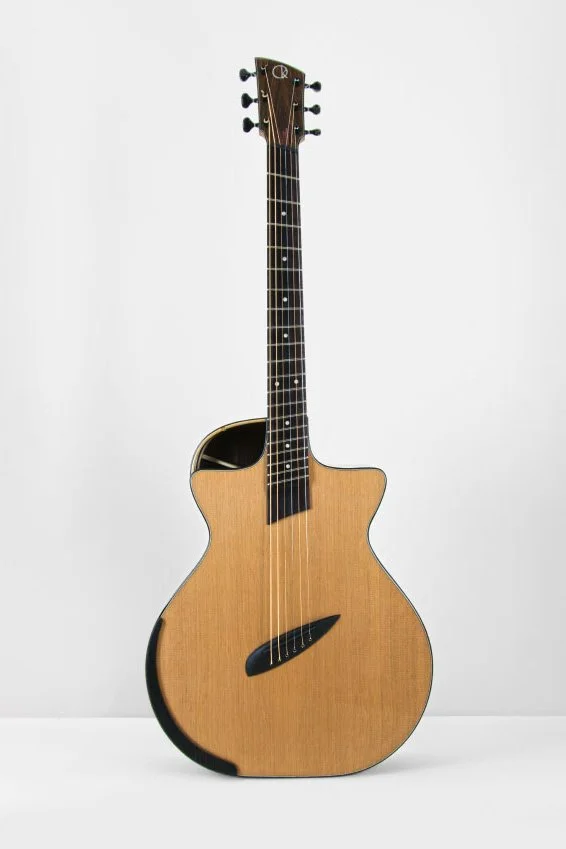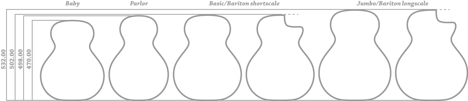 Die Vielfältigkeit im Bereich meiner Steelstring-Modelle bietet allen Gitarrenspielenden die passende Option – von den kleineren Parlor- und Baby-Modellen über die Basic- bis zur Jumbo-Korpusgröße. Das Modell Doubleshoulder baue ich in der Basic- und Jumbovariante, beides im Standardtuning oder als Baritongitarre, meine Bassgitarre mit Jumbokorpus. Das Zargenschalloch, sowie ein Armrest oder Bevel gehören zur Grundausstattung. Die Saiten werden durch die Serviceklappe am Unterklotz aufgezogen, was Stegstecker obsolet macht. Fächerbünde, Cutway, Pickup und andere Optionen planen wir optional.