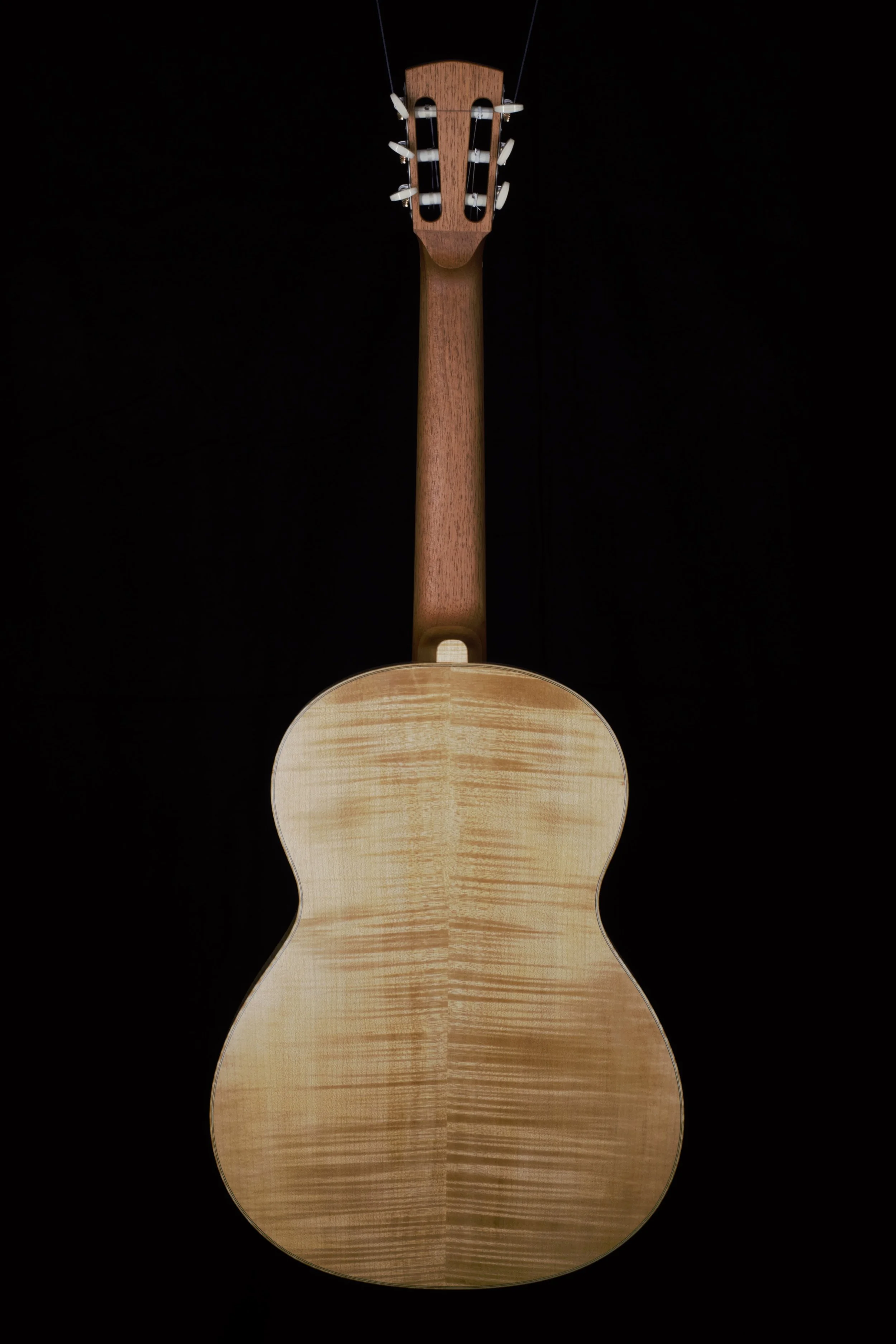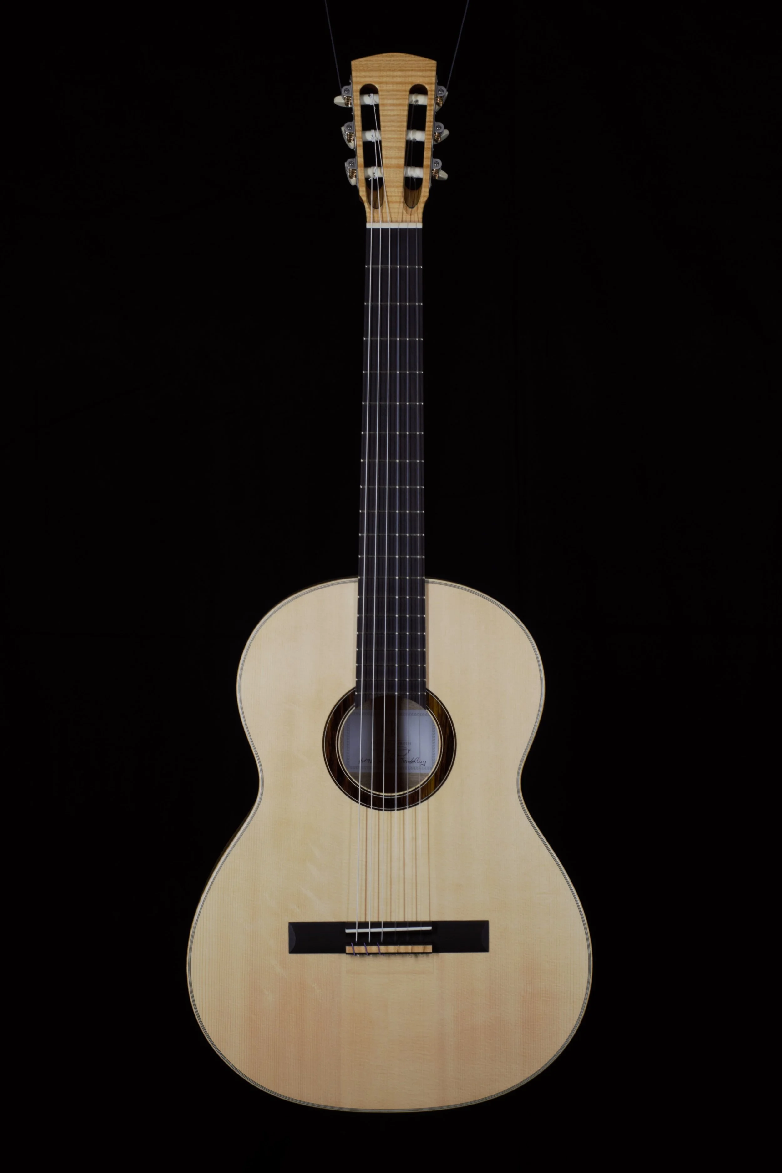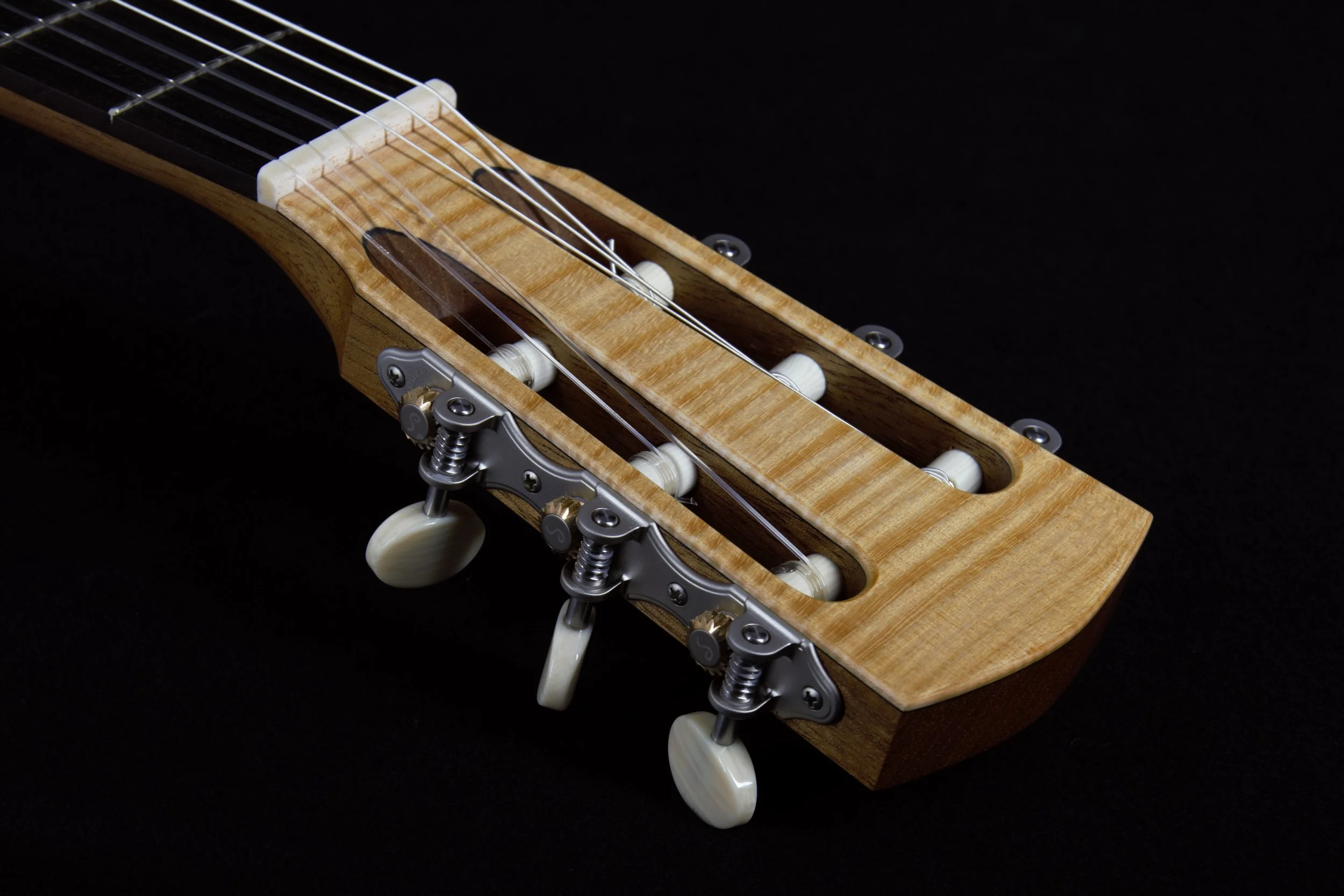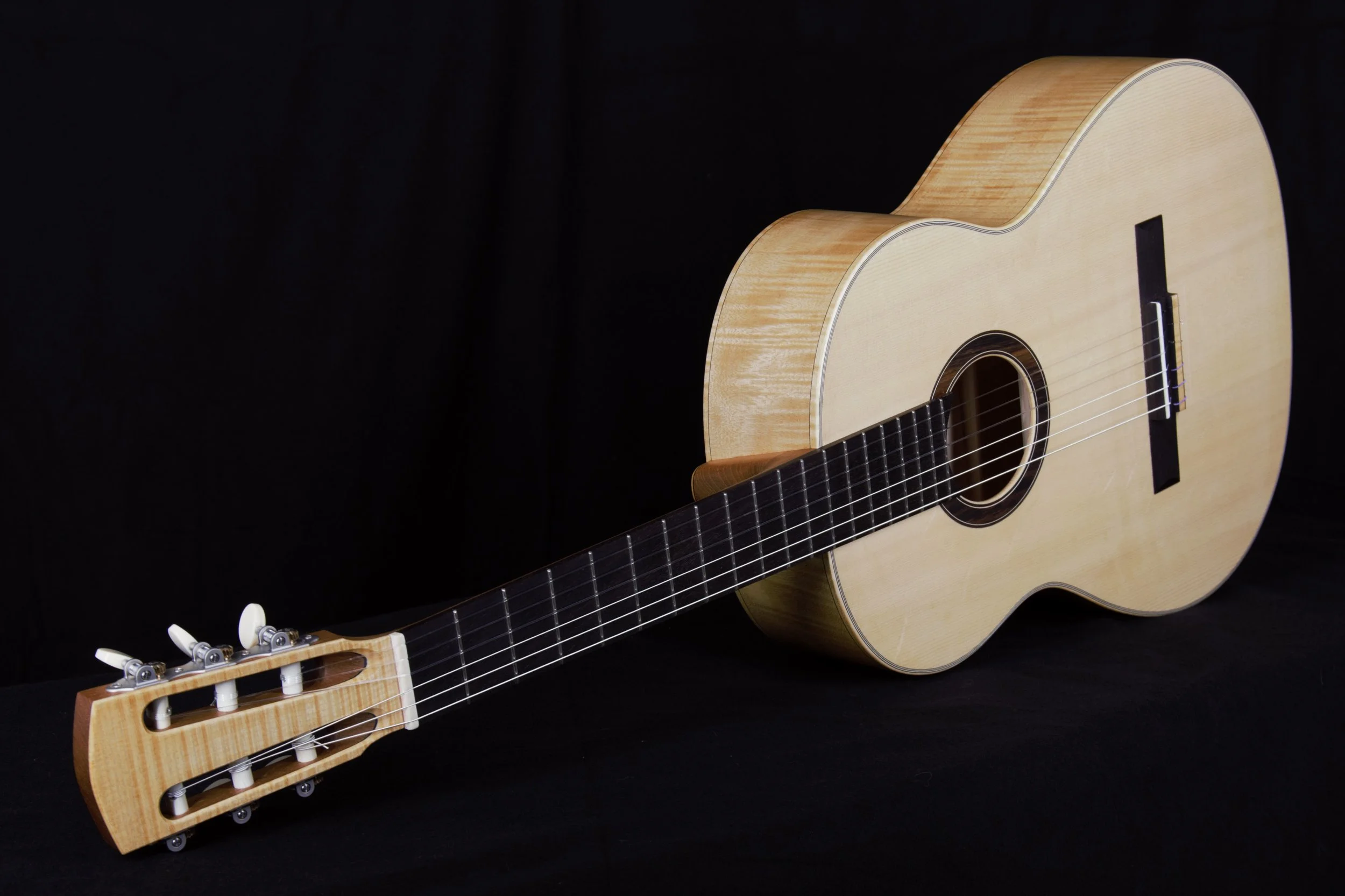 Die Decken der Gitarren habe ich aus ausgewählter Alpenfichte gefertigt, bei deren Beleistung ich von Instrument zu Instrument variiert habe. Böden und Zargen, sowie die Bindings sind aus Ahorn, welcher rund 80 Jahre auf einem Dachboden im Vogtland eingelagert war und wo ich diesen Schatz vor mehr als 10 Jahren bergen durfte. Die Griffbretter aus ostindischem Palisander stammen ebenfalls aus diesem Bestand, die Hälse sind aus Cedro. Die Palisanderstege mit Knochenstegeinlagen habe ich mit 12-Loch-Bohrungen versehen – für einen gleichmäßigen Saitendruck auf die Stegeinlage und ein komfortables Befestigen der Saiten am Knüpfblock. Die Decken der Gitarren sind mit einer Schellackpolitur versehen, alle übrigen Flächen mit einem Öl/Wachsfinish, welches das Holz zuverlässig schützt, aber keine schwingungsdämpfende Schicht aufbaut. Haptik und Optik bleiben somit angenehm natürlich.