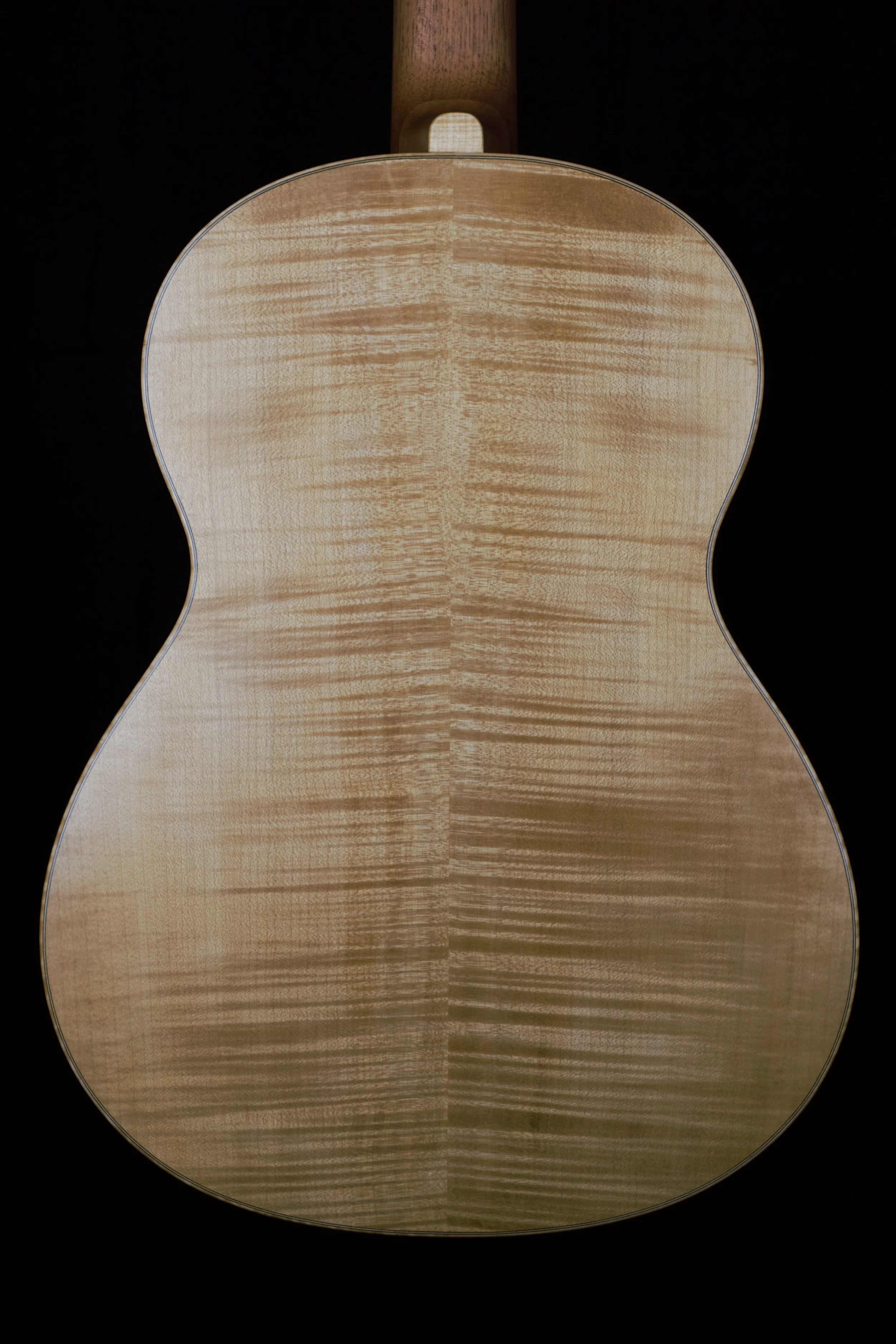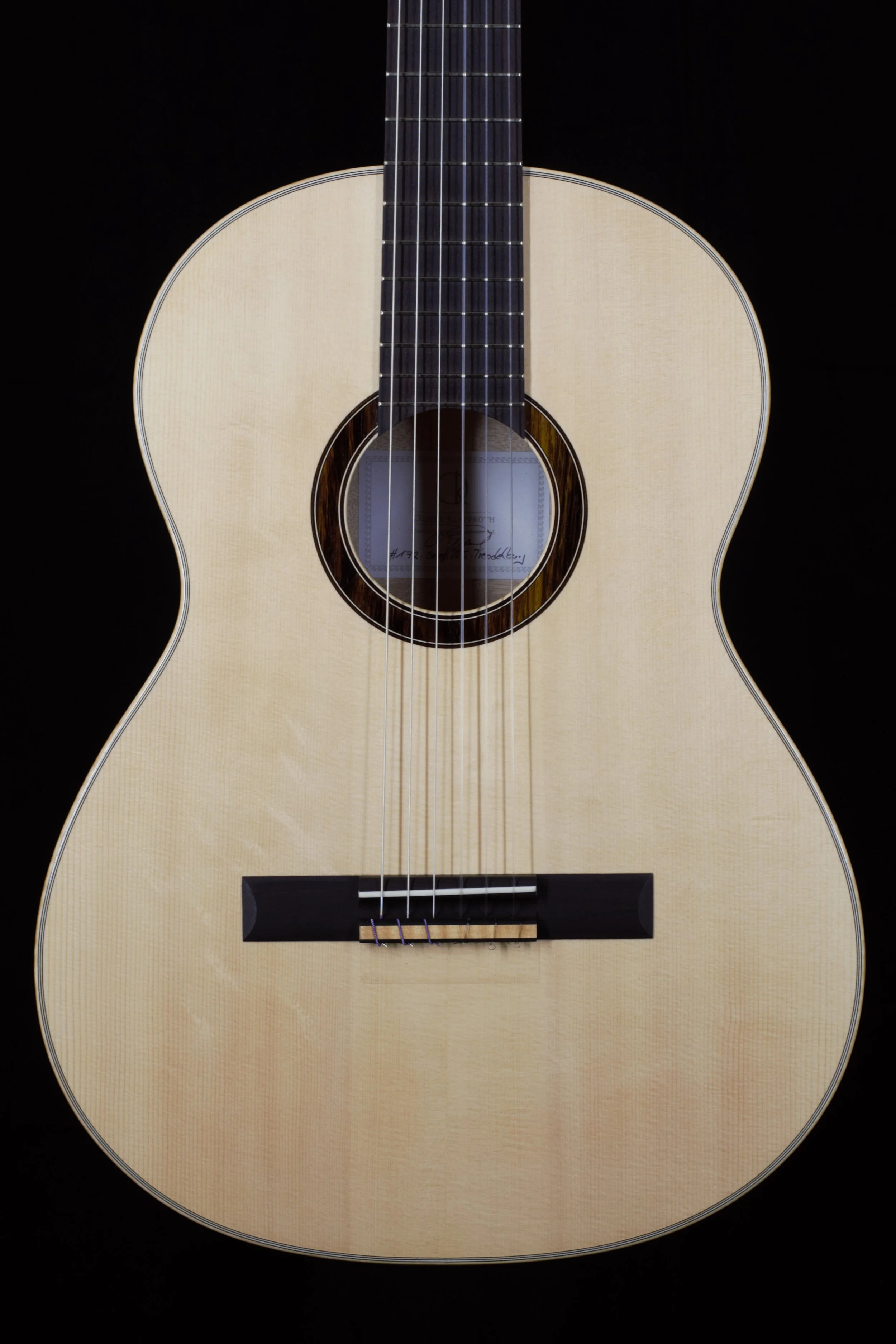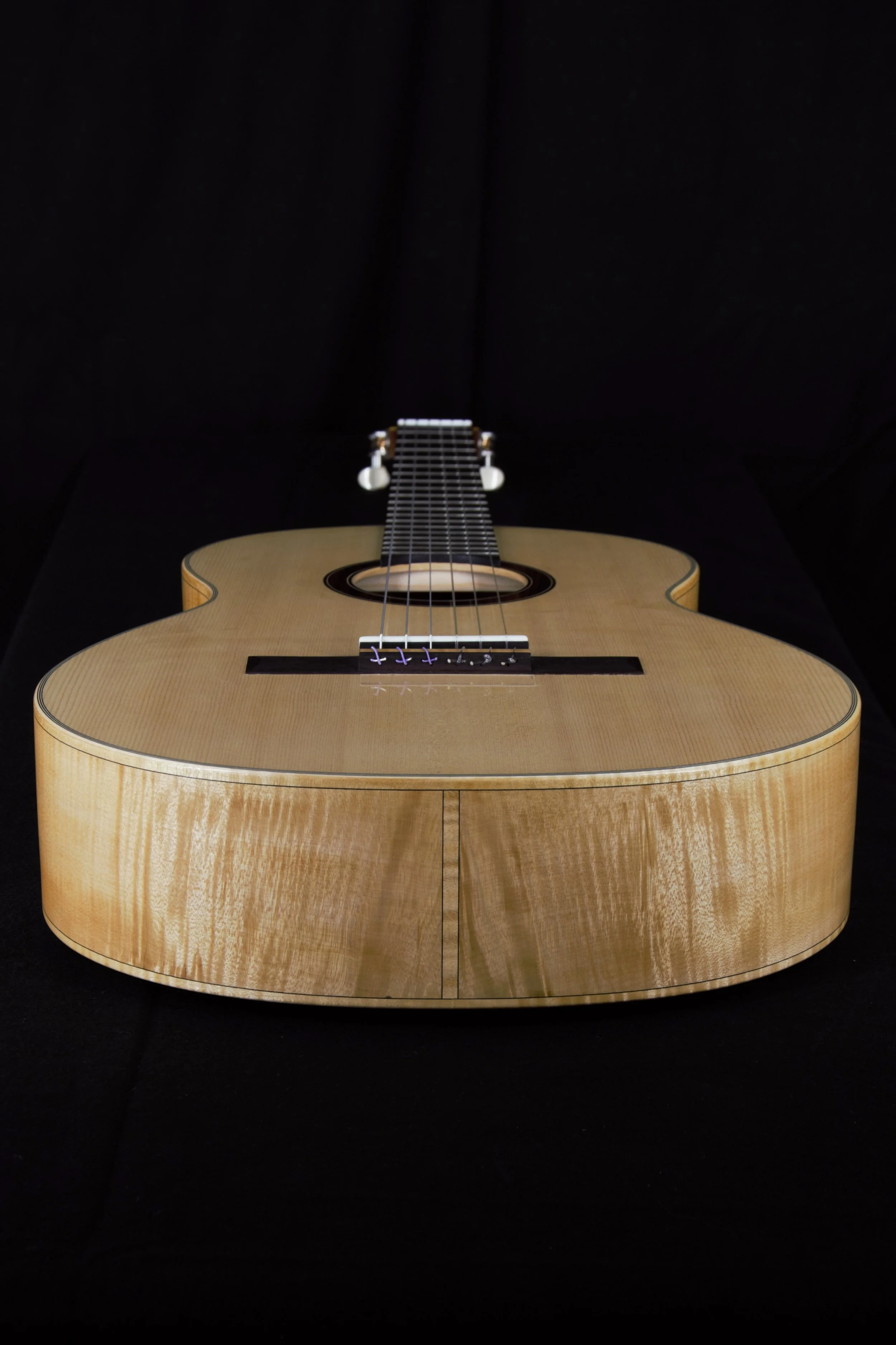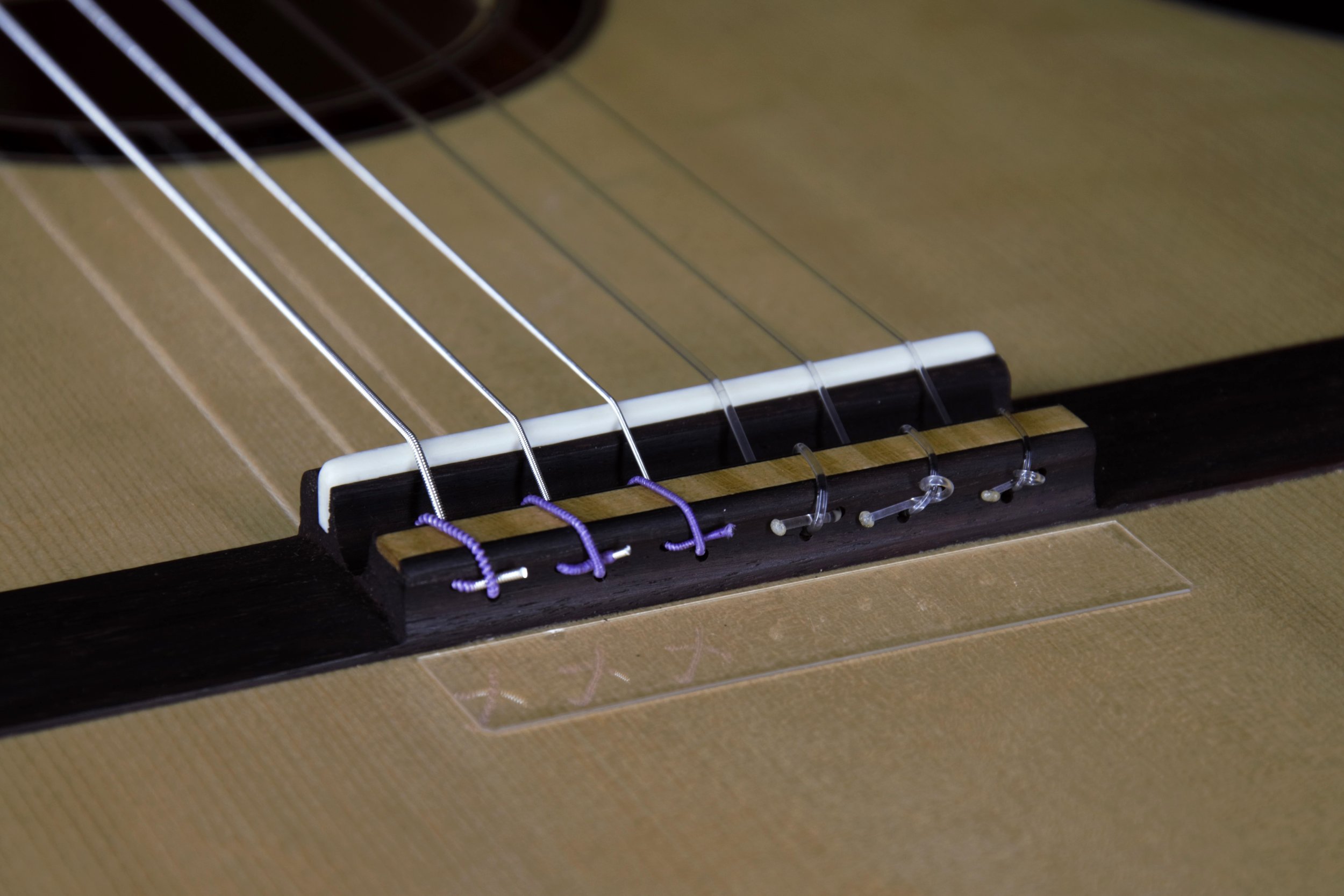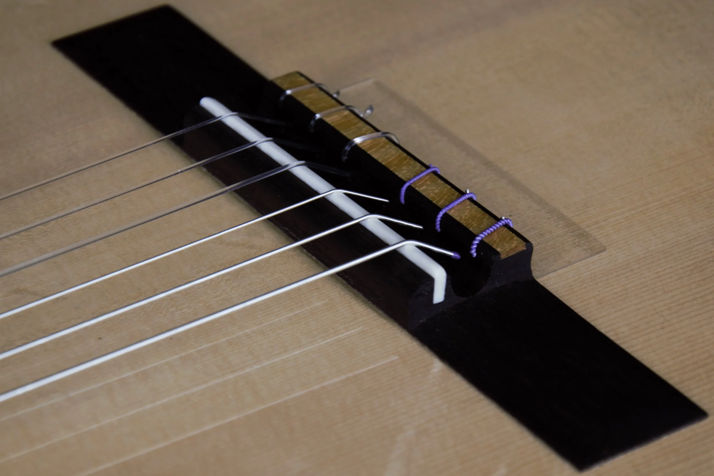 Die Decken der Gitarren habe ich aus ausgewählter Alpenfichte gefertigt, bei deren Beleistung ich von Instrument zu Instrument variiert habe. Böden und Zargen, sowie die Bindings sind aus Ahorn, welcher rund 80 Jahre auf einem Dachboden im Vogtland eingelagert war und wo ich diesen Schatz vor mehr als 10 Jahren bergen durfte. Die Griffbretter aus ostindischem Palisander stammen ebenfalls aus diesem Bestand, die Hälse sind aus Cedro. Die Palisanderstege mit Knochenstegeinlagen habe ich mit 12-Loch-Bohrungen versehen – für einen gleichmäßigen Saitendruck auf die Stegeinlage und ein komfortables Befestigen der Saiten am Knüpfblock. Die Decken der Gitarren sind mit einer Schellackpolitur versehen, alle übrigen Flächen mit einem Öl/Wachsfinish, welches das Holz zuverlässig schützt, aber keine schwingungsdämpfende Schicht aufbaut. Haptik und Optik bleiben somit angenehm natürlich.