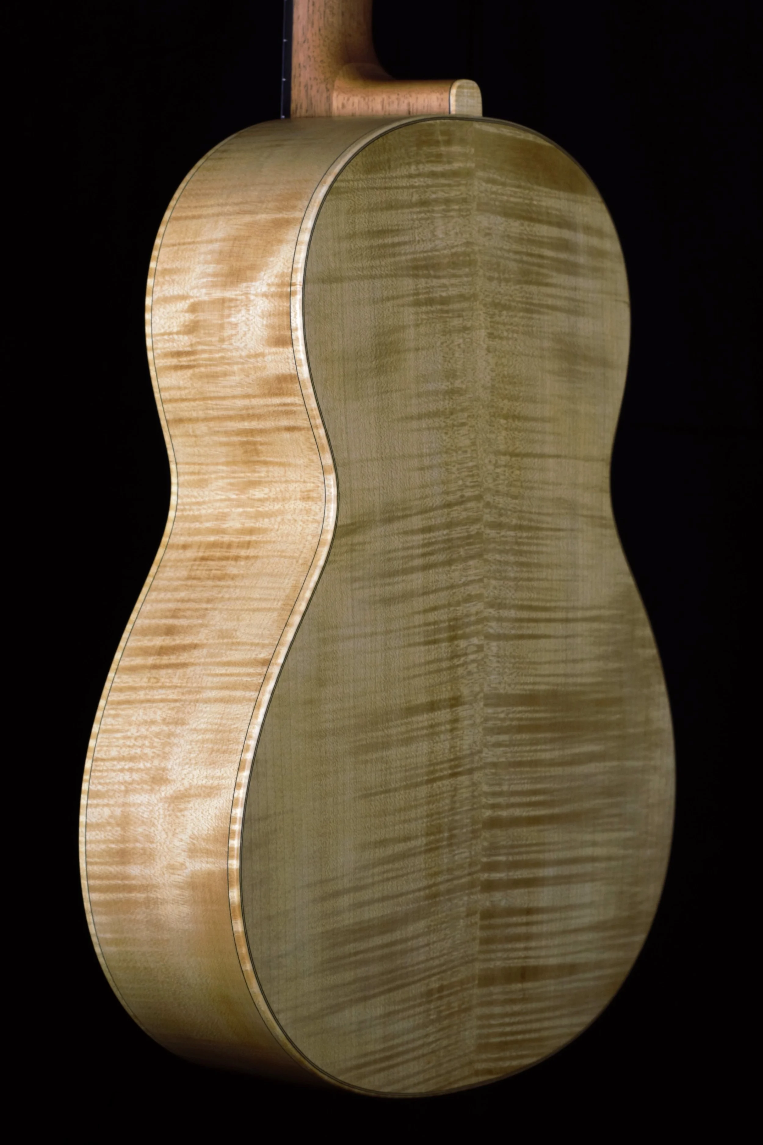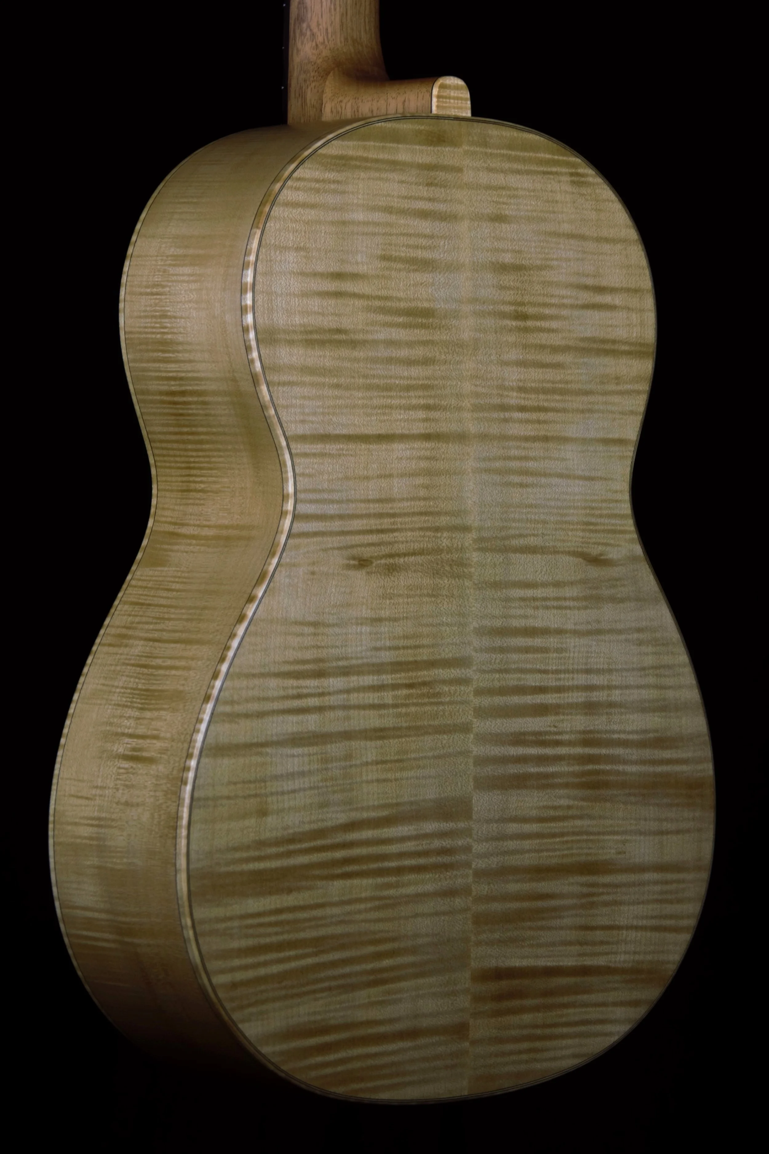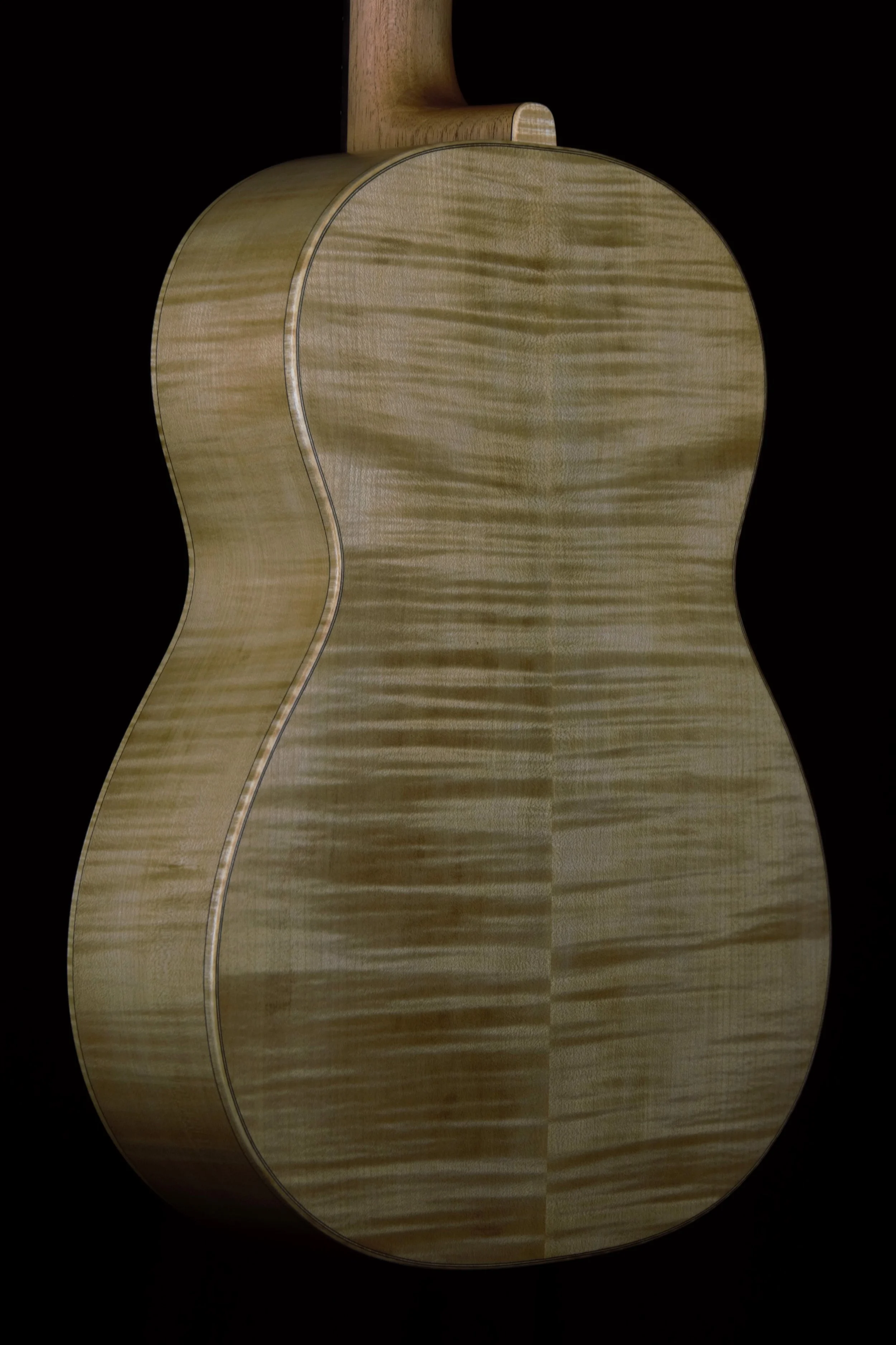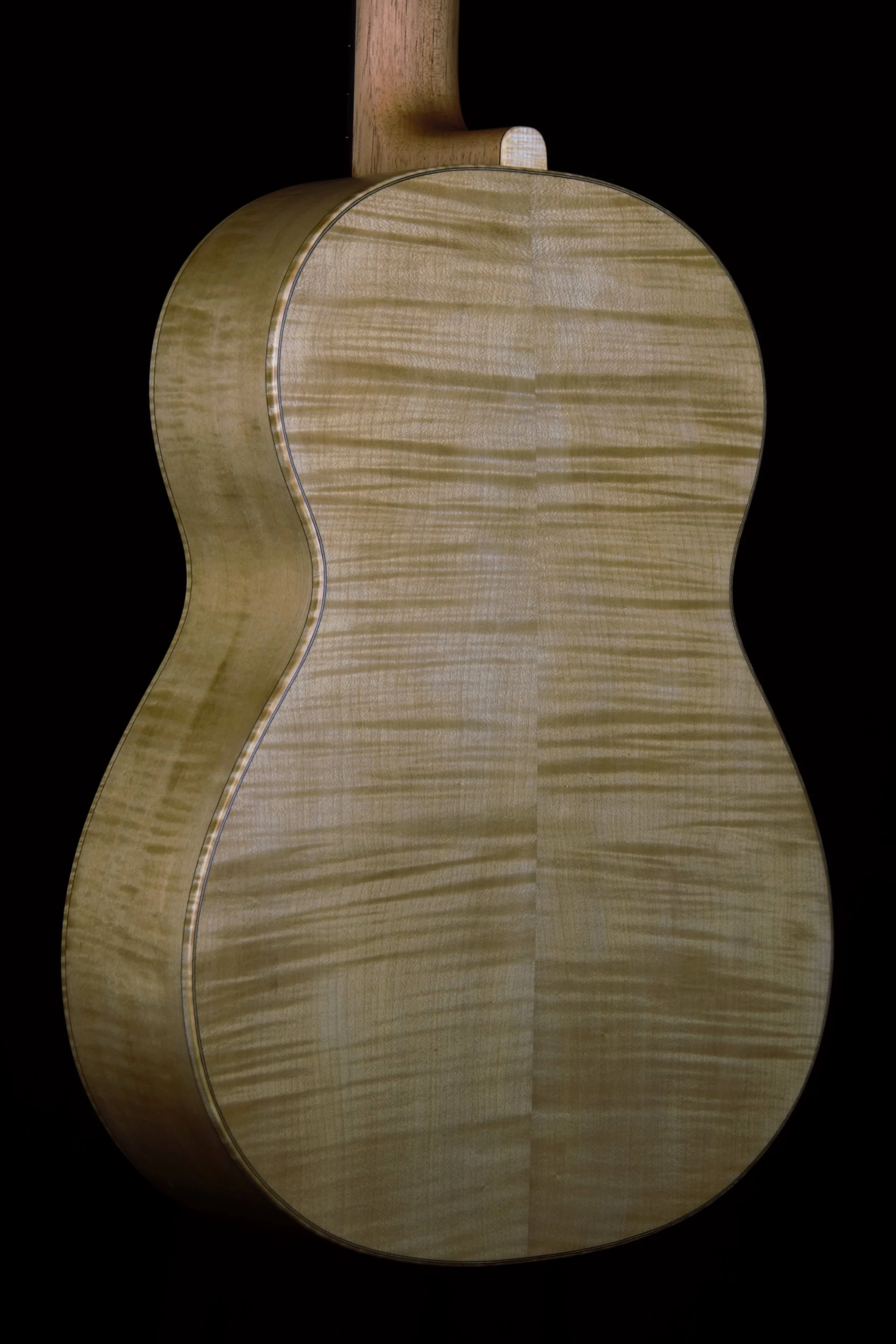 Die Decken der Gitarren habe ich aus ausgewählter Alpenfichte gefertigt, bei deren Beleistung ich von Instrument zu Instrument variiert habe. Böden und Zargen, sowie die Bindings sind aus Ahorn, welcher rund 80 Jahre auf einem Dachboden im Vogtland eingelagert war und wo ich diesen Schatz vor mehr als 10 Jahren bergen durfte. Die Griffbretter aus ostindischem Palisander stammen ebenfalls aus diesem Bestand, die Hälse sind aus Cedro. Die Palisanderstege mit Knochenstegeinlagen habe ich mit 12-Loch-Bohrungen versehen – für einen gleichmäßigen Saitendruck auf die Stegeinlage und ein komfortables Befestigen der Saiten am Knüpfblock. Die Decken der Gitarren sind mit einer Schellackpolitur versehen, alle übrigen Flächen mit einem Öl/Wachsfinish, welches das Holz zuverlässig schützt, aber keine schwingungsdämpfende Schicht aufbaut. Haptik und Optik bleiben somit angenehm natürlich.