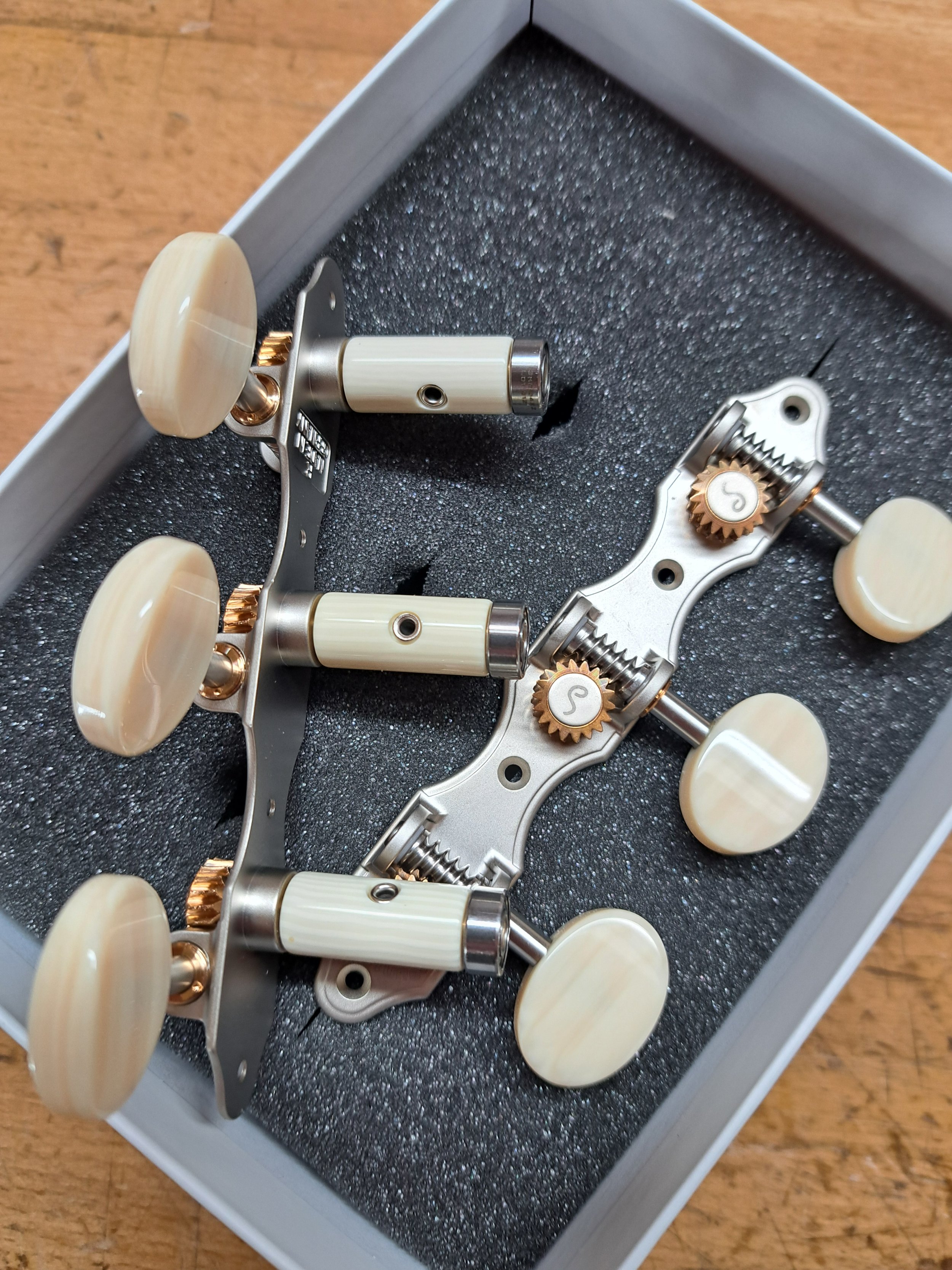 Die Mechaniken der Marke Schaller sind aus der „Grand Tune“-Serie mit kugelgelagerten Wellen.
